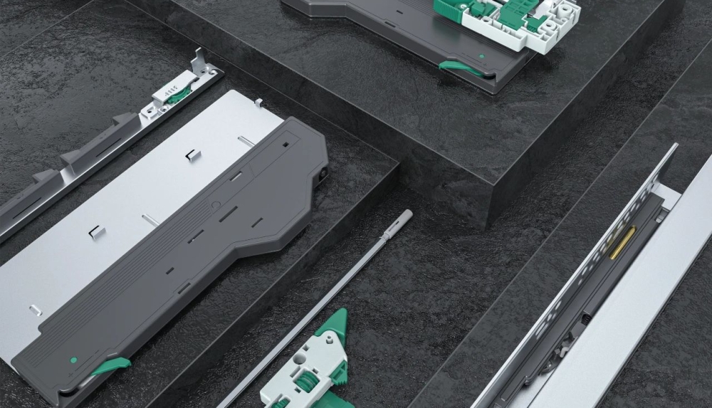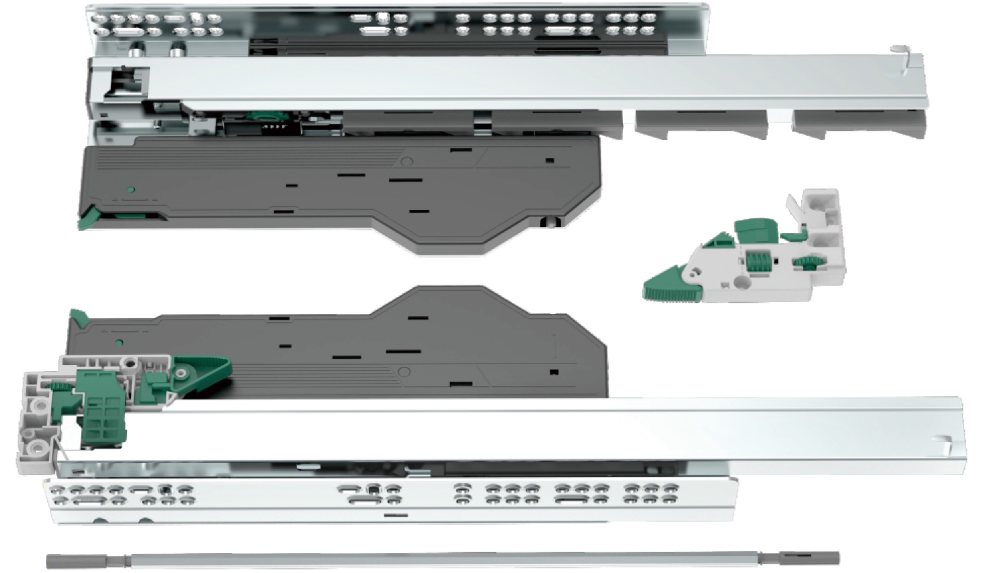 产品特性: 隐藏式中外轨同步拉出,按弹开启缓冲复位